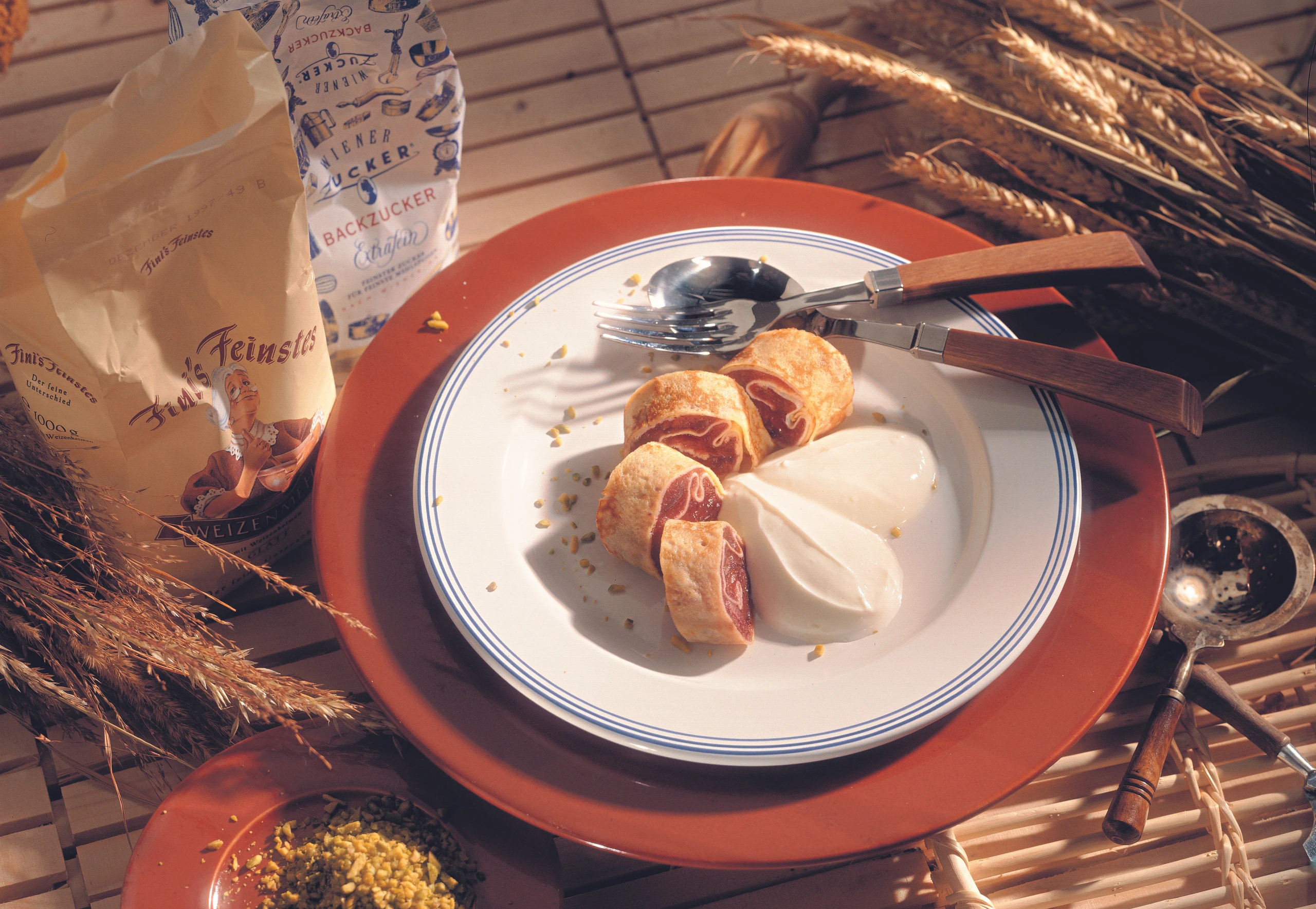 - Mehl, Milch, Obers sowie je eine Prise Salz und Vanillezucker gut verrühren. Eier und Dotter zum Schluß einrühren. Teig durch ein Sieb gießen, um eventuelle Klümpchen zu entfernen. Teig ca. 10 Minuten rasten lassen. In einer Pfanne (am besten beschichtet; Ø 26 cm) nacheinander, jeweils in wenig Öl, zehn gleichgroße Palatschinken backen. Palatschinken nebeneinander auflegen und auskühlen lassen.