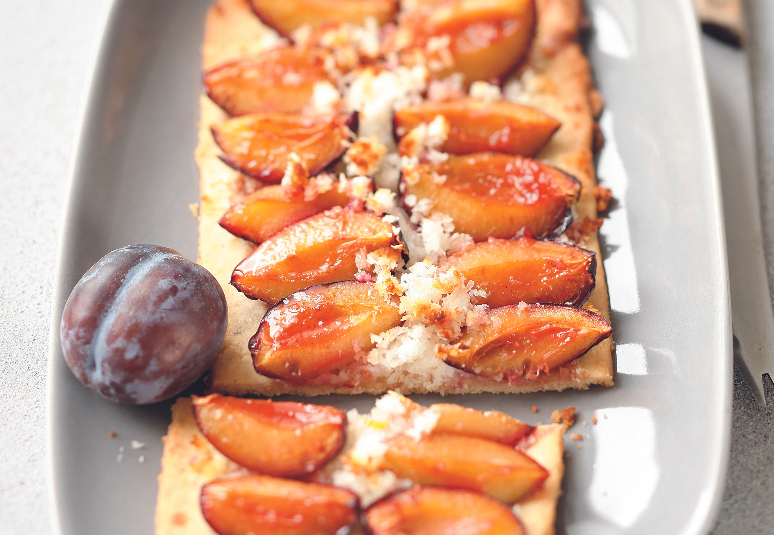 Rohr auf 190°C vorheizen. Mürbteig auf einem Blatt Backpapier 3 mm dick ausrollen (40 x 34 cm) und auf das Backblech ziehen. Teig mit den Zwetschken belegen, Kokosmasse darauf verteilen. Kuchen im Rohr (mittlere Schiene) ca. 20 Minuten backen.