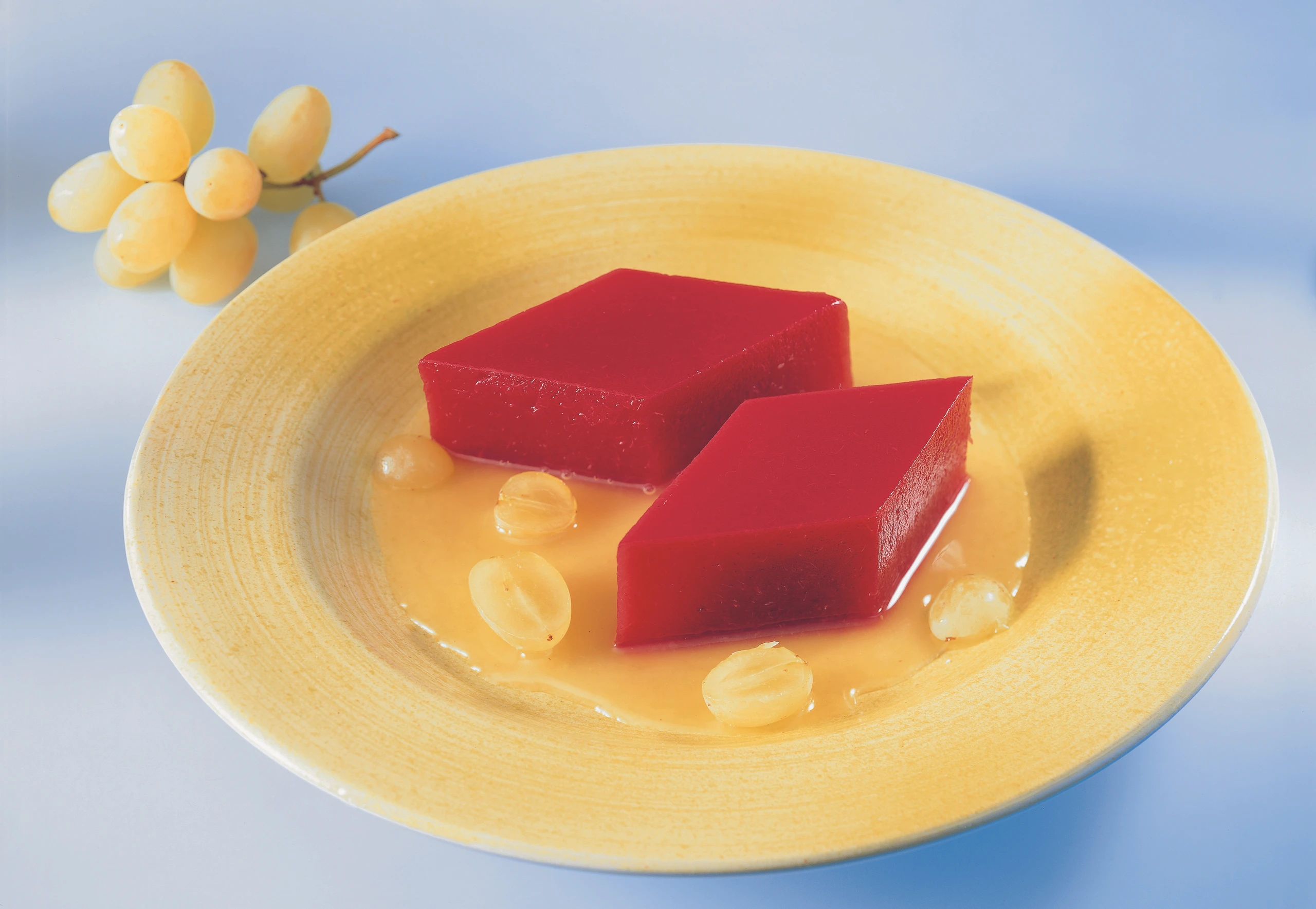 - Zwetschkengelee herausstürzen, in Würfel oder Rauten schneiden, mit der Sauce und den Trauben anrichten.