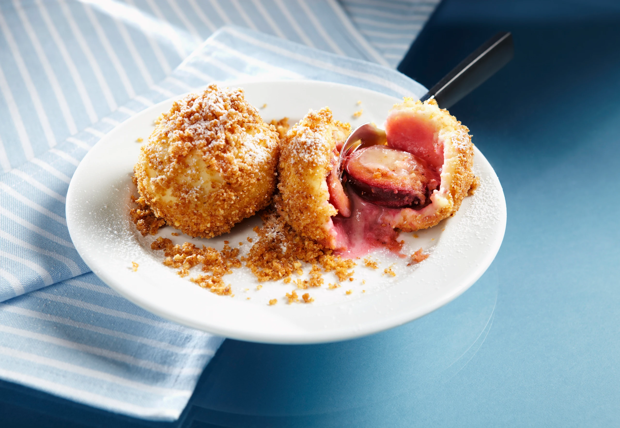 Zwetschken darauflegen, mit dem Teig umhüllen und zu Knödeln formen; dabei die Luft herausdrücken. Reichlich Salzwasser aufkochen, Knödel einlegen und bei schwacher Hitze ca. 8 Minuten köcheln.