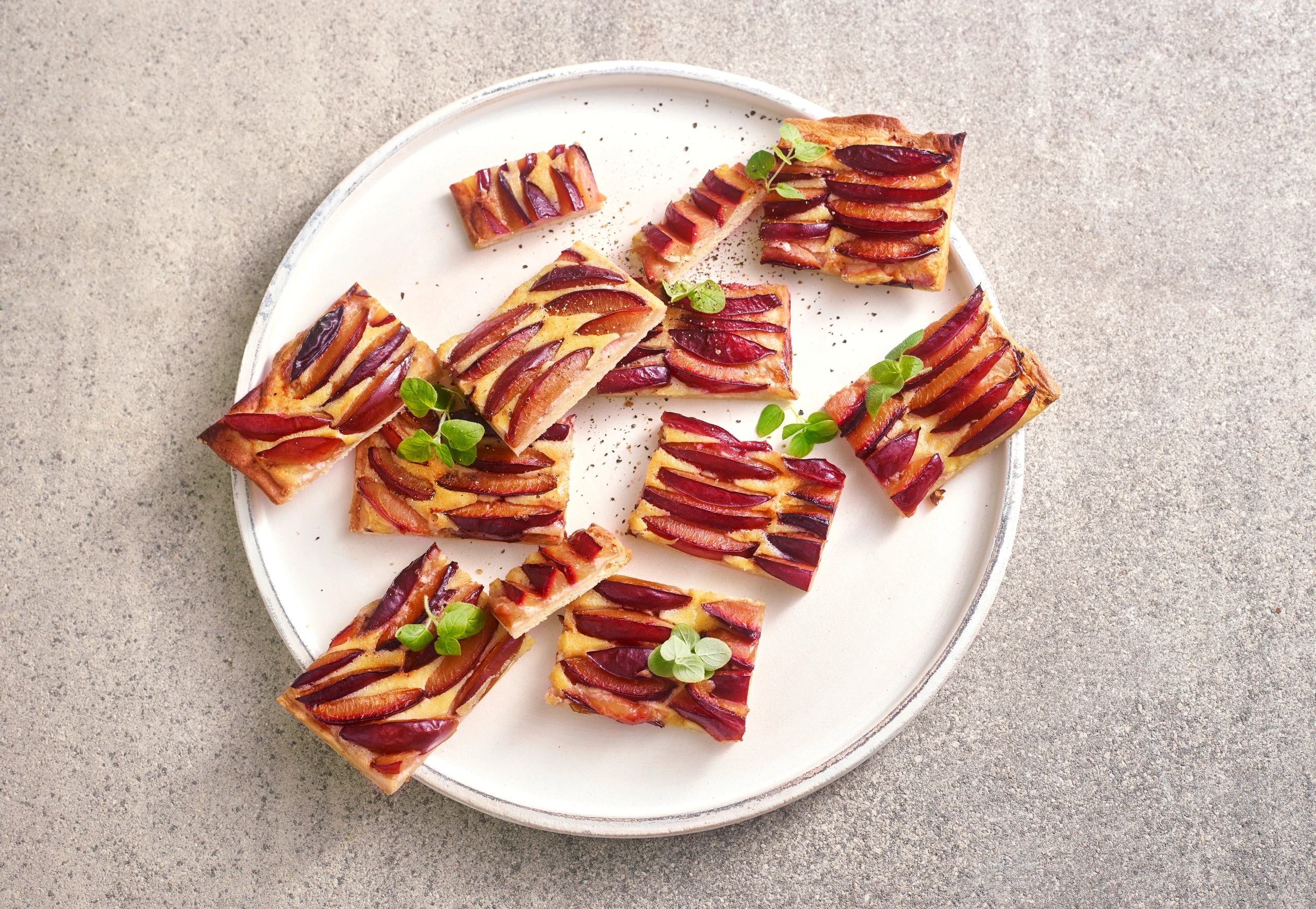 - Käsemasse auf dem Teig verstreichen, mit Zwetschken belegen und im Rohr (mittlere Schiene) ca. 15 Minuten backen. Kuchen herausnehmen und portionieren, eventuell mit Majoran oder Oregano garnieren.