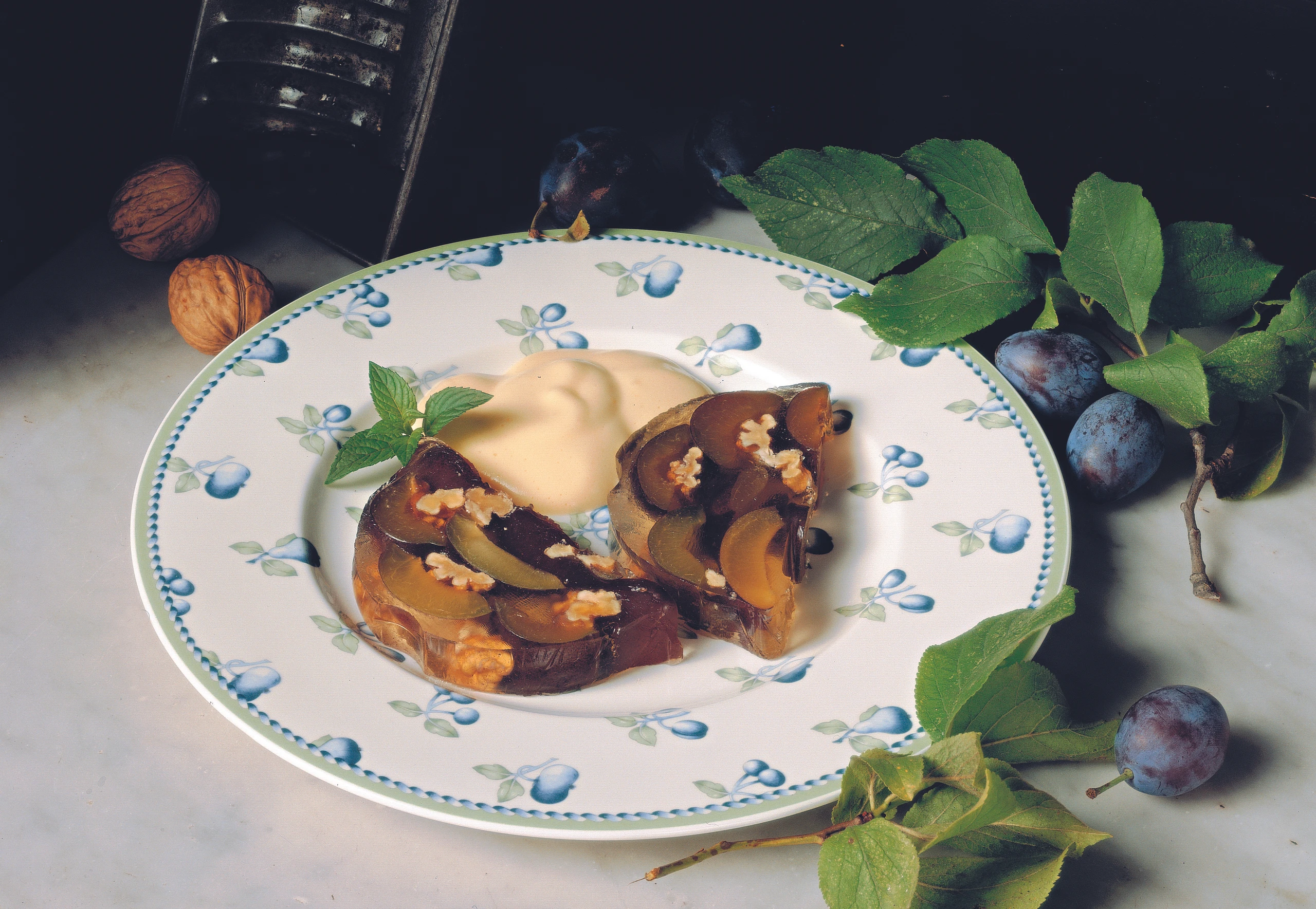 - Zwetschkensulz aus der Form stürzen, Folie abziehen. Sulz in Scheiben schneiden und mit Veltliner Sabayon (siehe Rezept) anrichten.