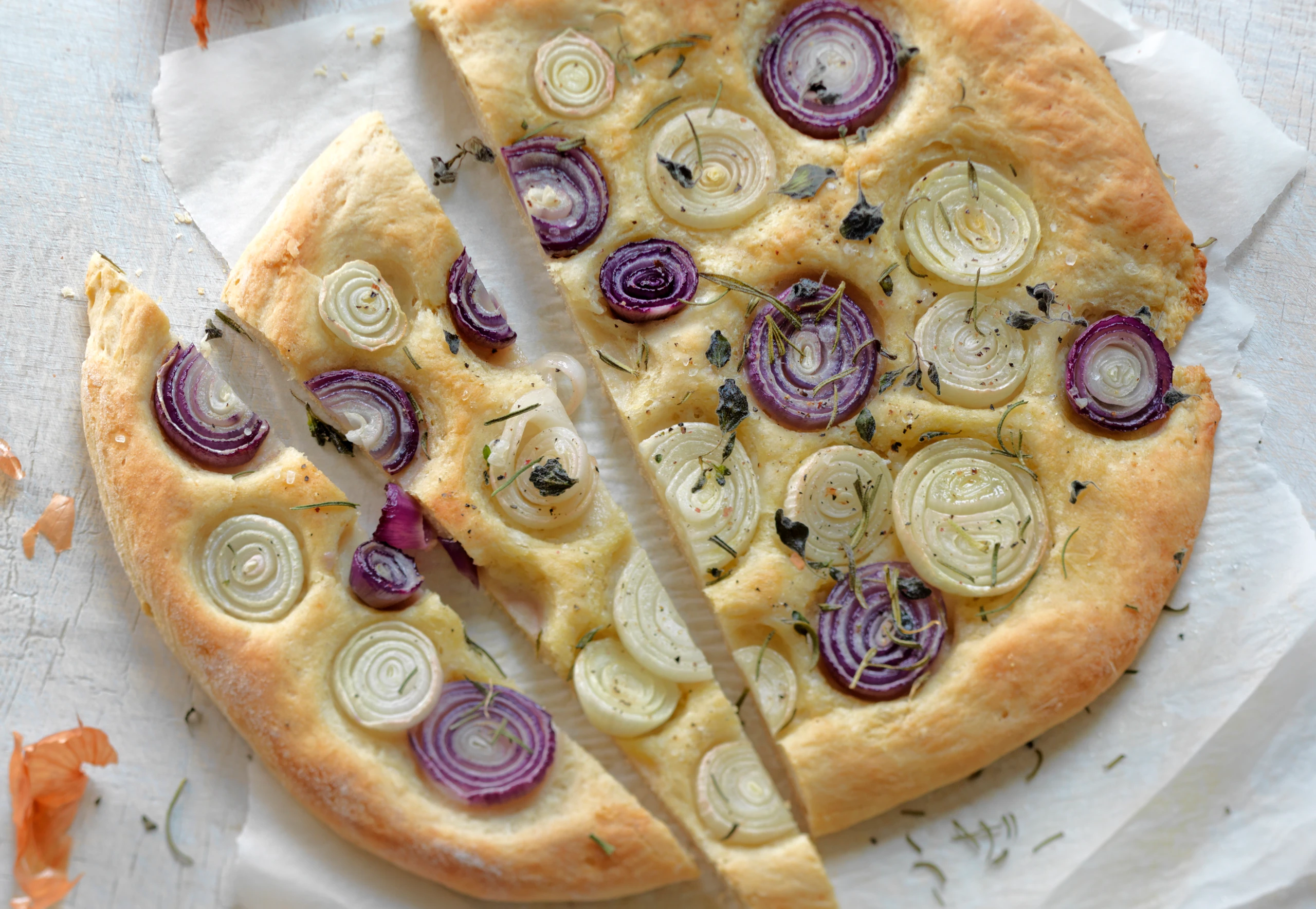 Zwiebeln schälen, in ca. 1,5 cm dicke Ringe schneiden, auf dem Fladen verteilen und leicht in den Teig drücken. 15 Minuten gehen lassen. Rohr auf 180°C vorheizen.