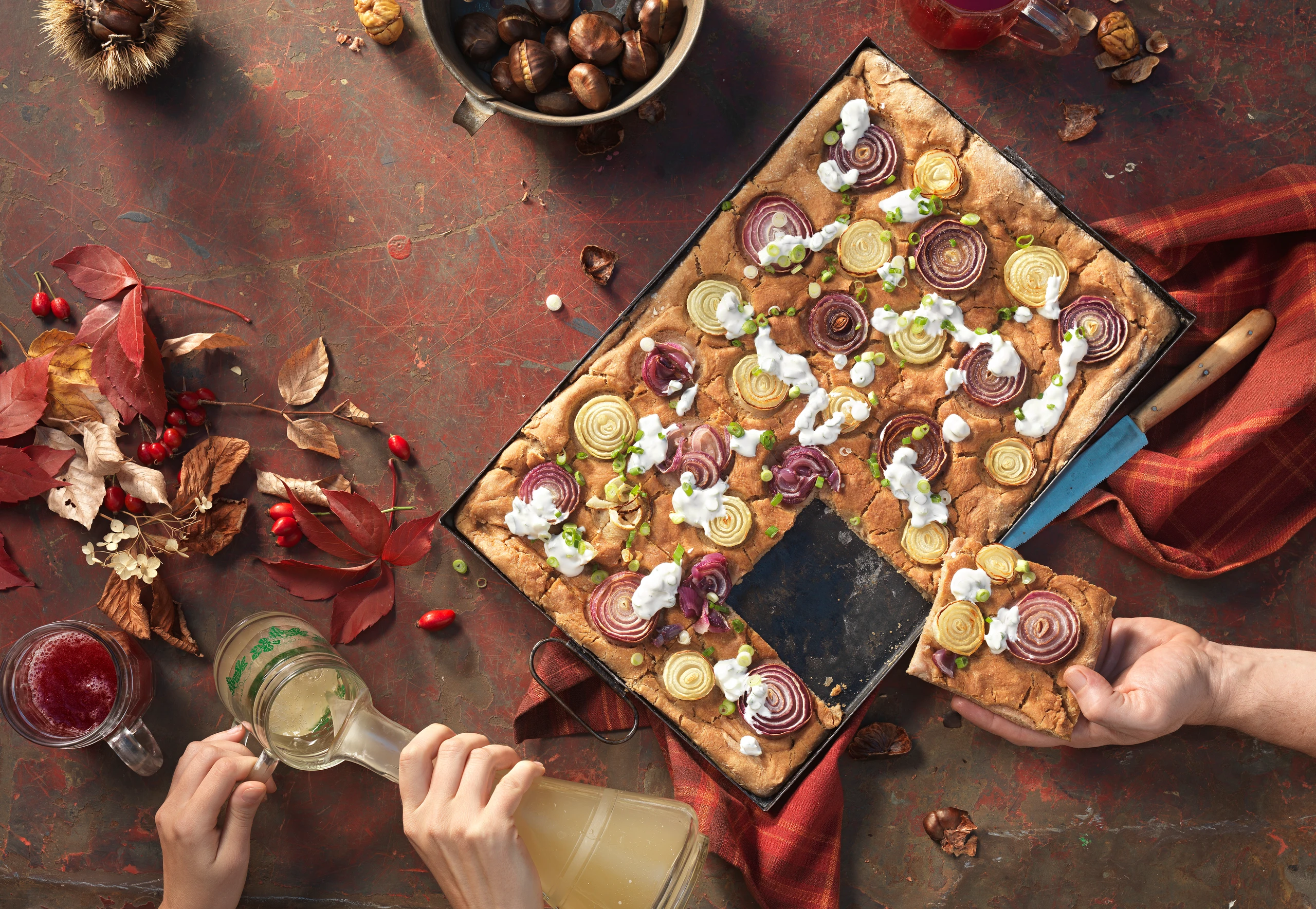 Sauerrahm mit Joghurt, wenig Salz und Pfeffer verrühren. Jungzwiebeln putzen, in feine Ringe schneiden und unter den Rahm mengen. Zwiebelfocaccia aus dem Rohr nehmen, mit Rahm beträufeln. Warm servieren.