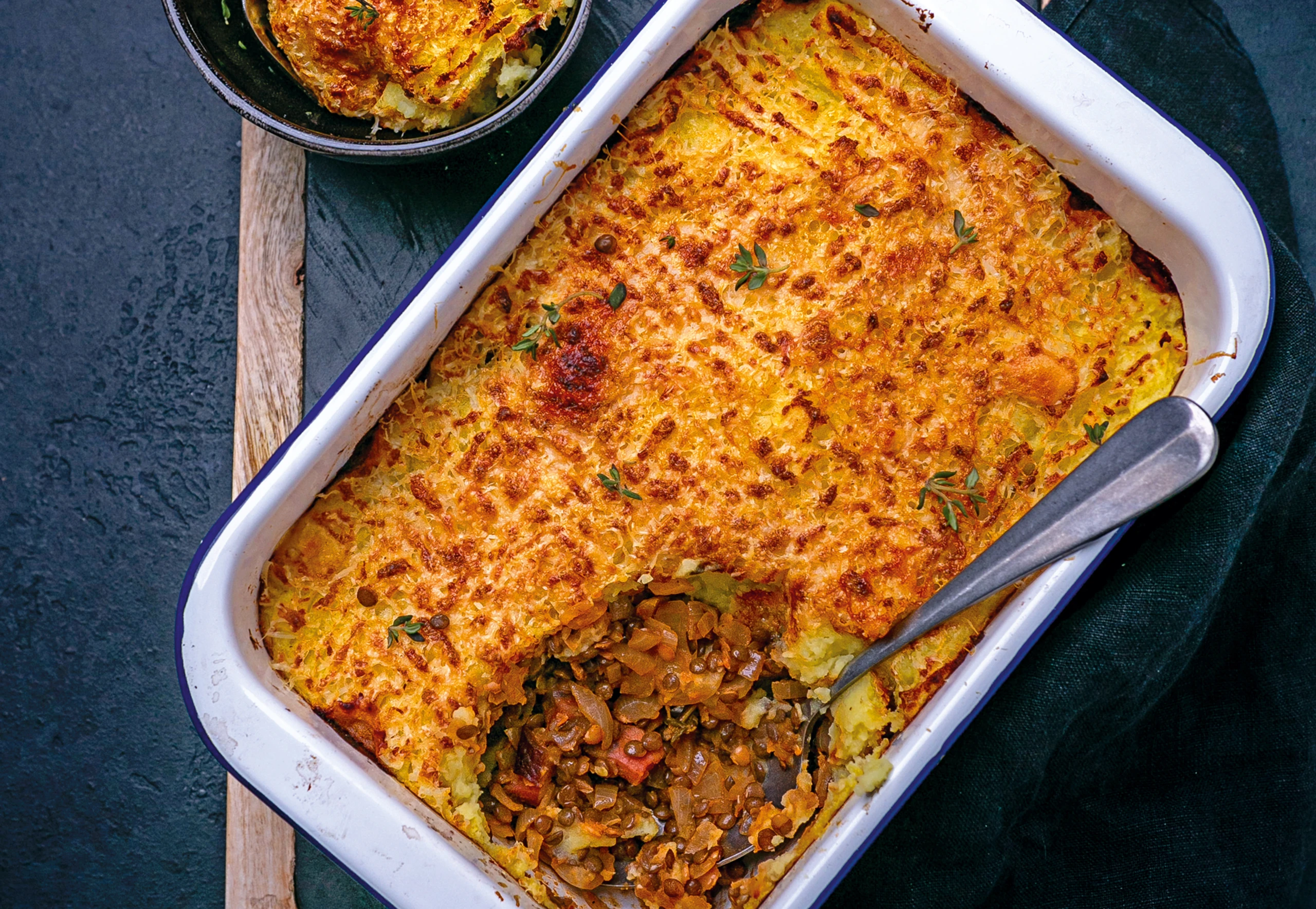 Linsenmischung in eine Auflaufform füllen und das Püree gleichmäßig darauf verteilen. Parmesan darüber reiben. Den Auflauf im Rohr ca. 20 Minuten backen.