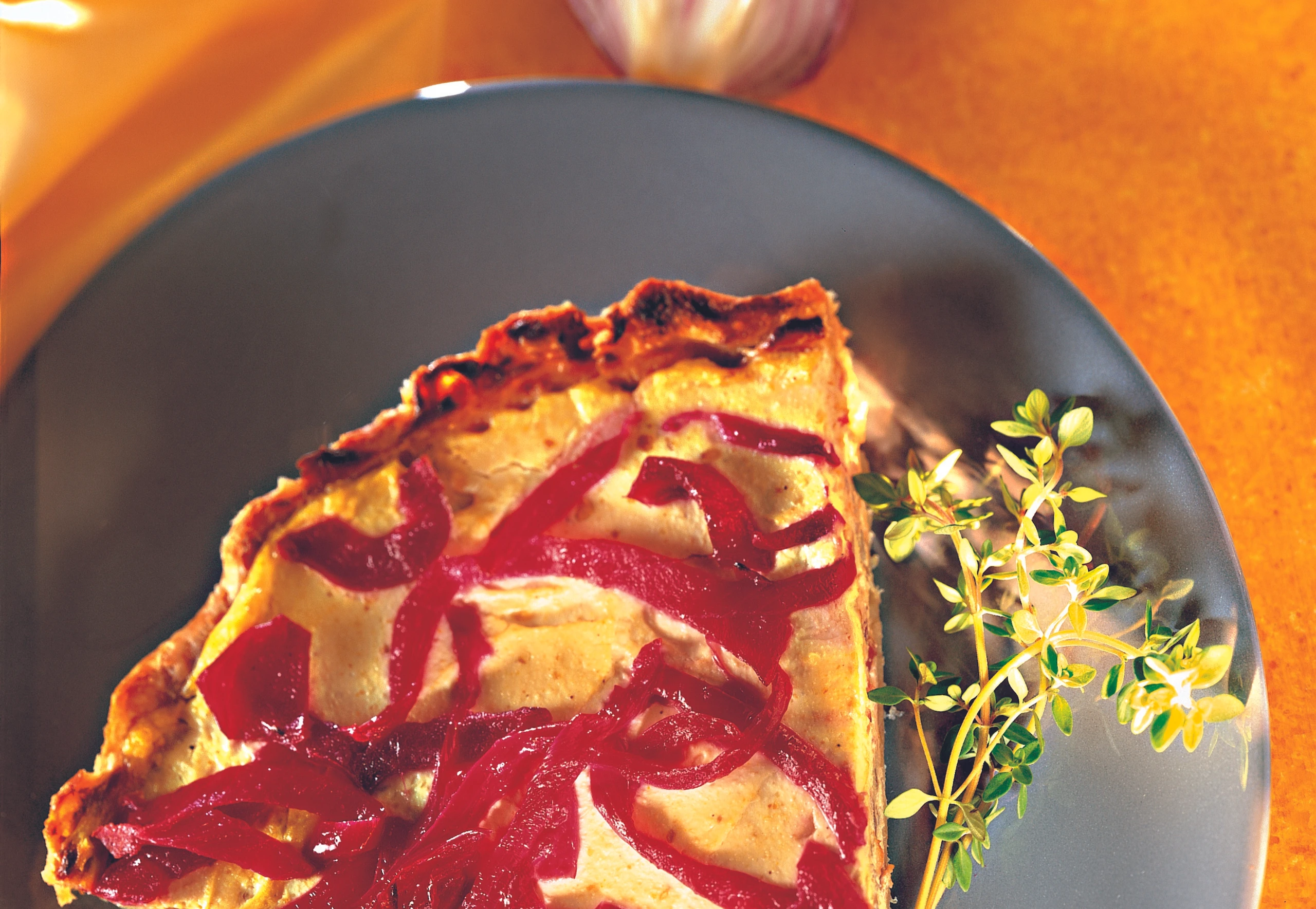 Teig auf einer leicht bemehlten Arbeitsfläche ca. 1/2 cm dick ausrollen. Eine Tarteform (Ø 28 cm) mit dem Teig auslegen. Teig mit einer Gabel mehrmals einstechen. Tofu-Zwiebelmasse in die Form füllen und gleichmäßig verstreichen. Kuchen im vorgeheizten Rohr (mittlere Schiene / Gitterrost) ca. 35 Minuten backen, aus dem Rohr nehmen und vor dem Anschneiden einige Minuten rasten lassen.
