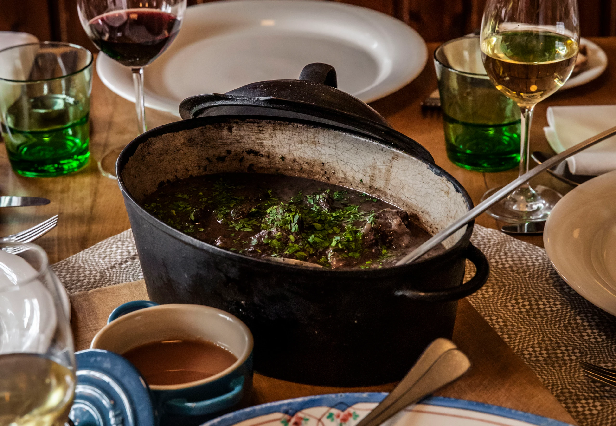 Zwiebelfleisch mit Rotwein und Rahmnockerln