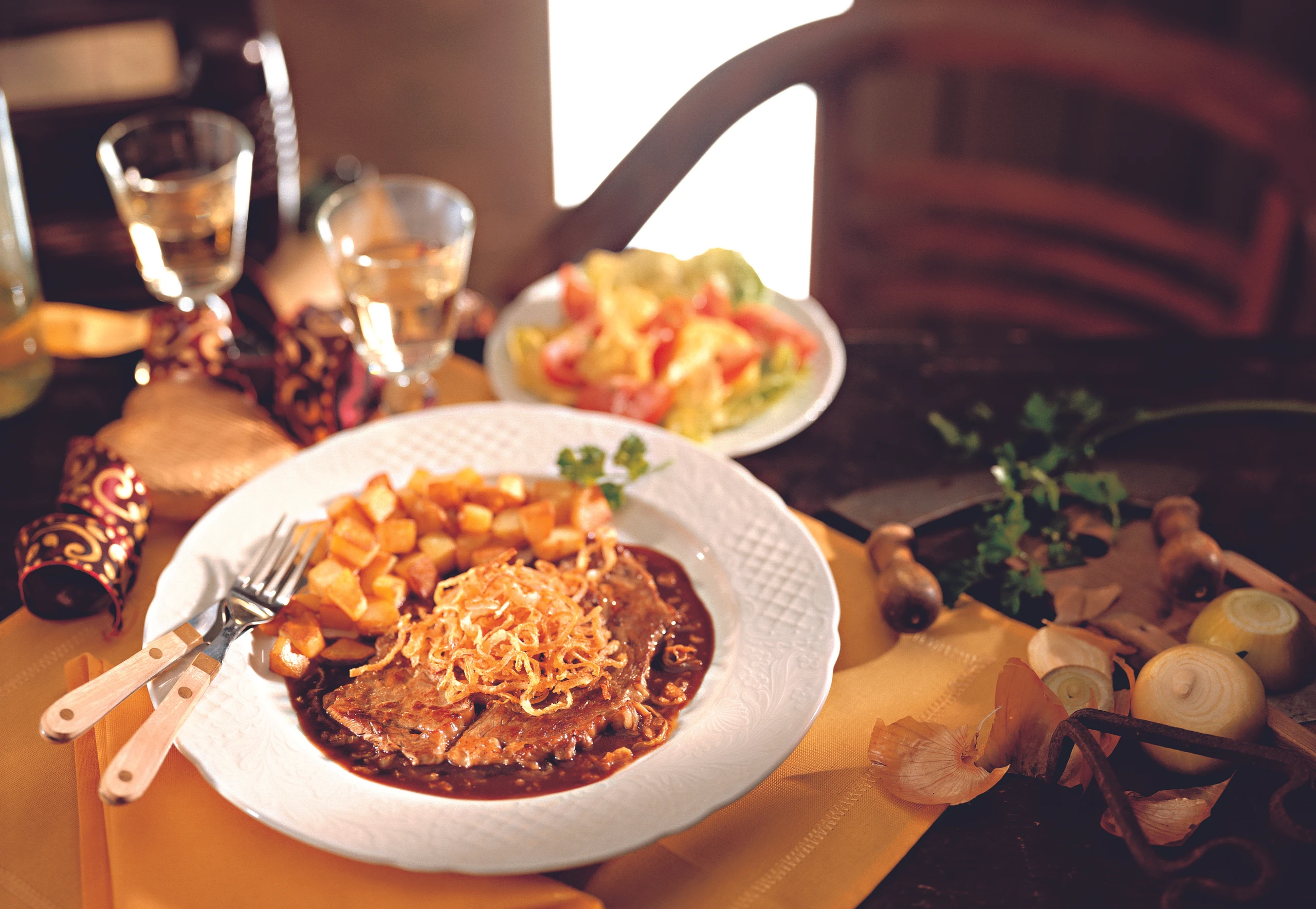 Zwiebelrostbraten mit Erdäpfeln und Paradeisersalat